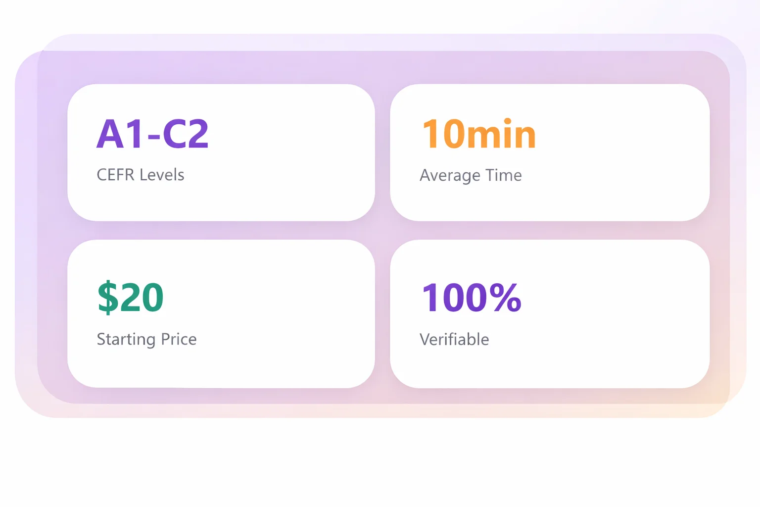 Receive instant CEFR level and verifiable English proficiency certificate.